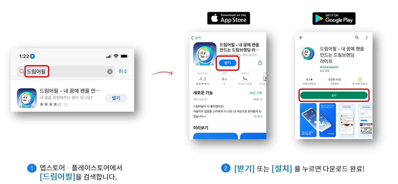 애플 앱스토어, 구글 플레이스토어에서 드림어필을 다운받아 보세요.